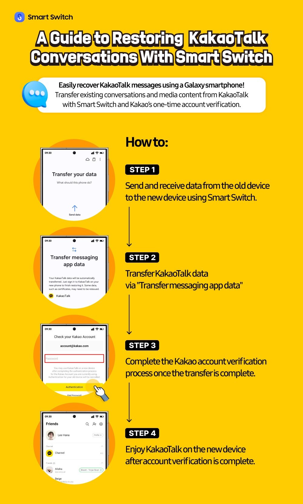Committed to providing a satisfying experience for all, Samsung is always listening to the voices of Galaxy users and looking for open collaborations and product enhancements. Please follow the guide below to learn how to use the KakaoTalk restoration feature through Smart Switch.