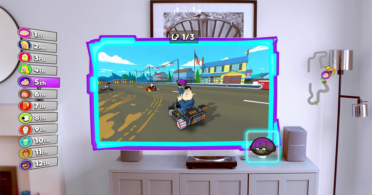 Apple Arcade players with Apple Vision Pro can boost their way into a whole new dimension in the raucous racing game Warped Kart Racers, releasing today on the service. Spatial titles on Apple Vision Pro deliver new gameplay experiences that blend digital content with the physical world. In Warped Kart Racers, players take control of some of their favorite 20th Television animated characters from American Dad!, Family Guy, King of the Hill, and Solar Opposites, using their hands to steer, drift, and throw objects as if driving a real kart in single-player and multiplayer matches.