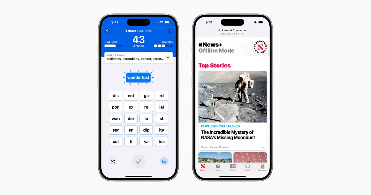 Apple News+ introduced Quartiles, a new original spelling game, and a new Offline Mode that automatically provides recent and personalized News content for subscribers when they’re not connected to Wi-Fi or a cellular network. Both features are available with iOS 17.5 or later for News+ subscribers.1