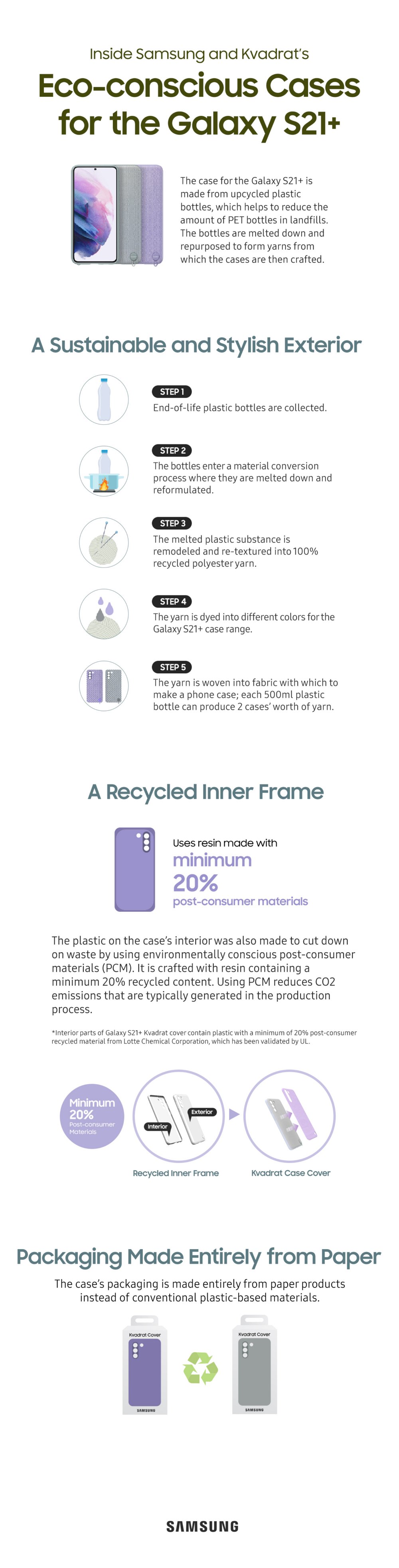 1 Interior parts of Galaxy S21+ Kvadrat cover contain plastic with a minimum of 20% post-consumer recycled material from Lotte Chemical Corporation, which has been validated by UL.