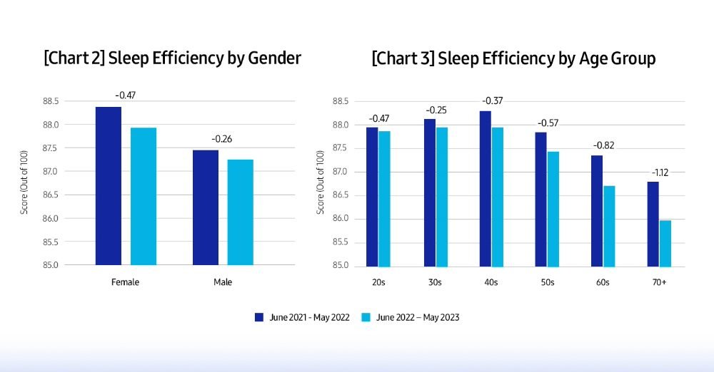 - Older demographics showed a greater decline in sleep efficiency. Notably, individuals aged over 70 experienced a decline nearly twice as much as that observed in those in their 20s. (Chart 3)