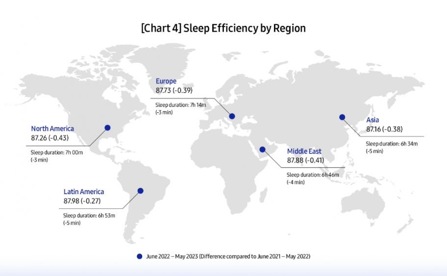 - North America witnessed the greatest decrease in sleep efficiency, while Asia maintained the lowest. (Chart 4)