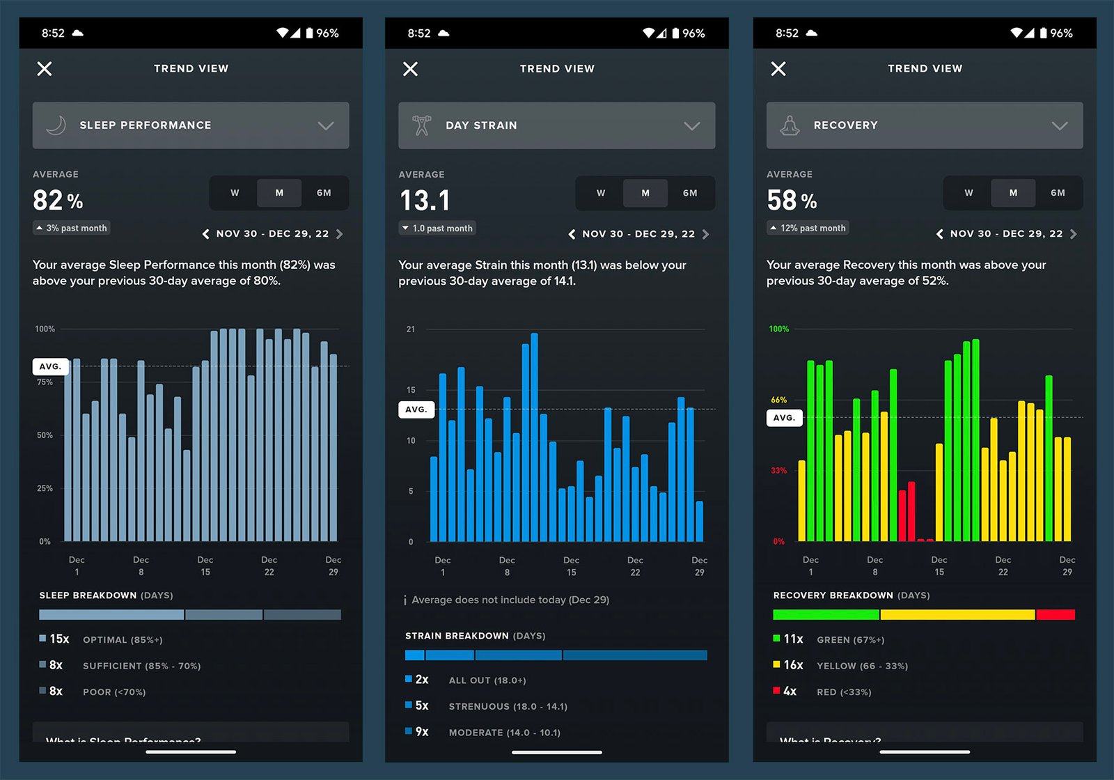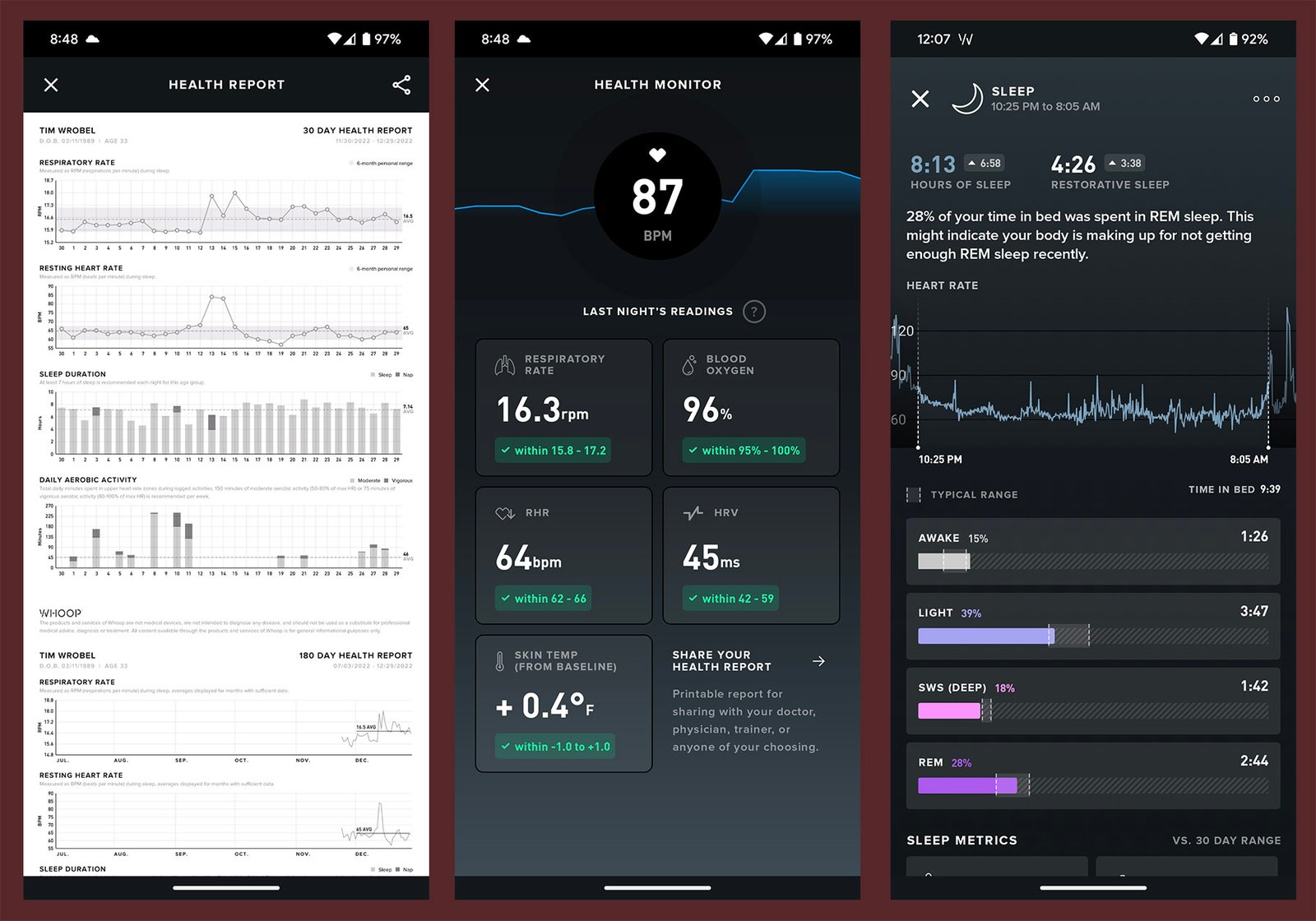 Once you have worn WHOOP long enough, more features are unlocked. When access to all data is available, users can find and share entire Health Reports, as well as Weekly Performance Assessments and Monthly Performance Assessments. In terms of using that data to maintain a certain fitness resolution, WHOOP is great at letting you know when it’s appropriate to push your body. In the world of fitness, we talk about burn out. People go super hard at the beginning of a year, then they quickly fall off because what they start with can’t be maintained for an extended period. With WHOOP, you can know what days to turn it on and what days you should focus on recovery. It’s been an invaluable tool for me.
