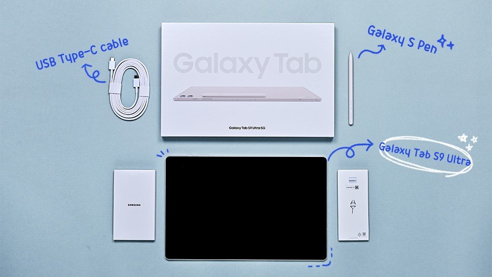 The box contains the Galaxy Tab S9 Ultra, Galaxy S Pen, Ejection Pin and USB Type-C cable. To provide increased usability across the Samsung Galaxy ecosystem, the S Pen can be used with Samsung Galaxy smartphones and Galaxy Books that support S Pen as well.
