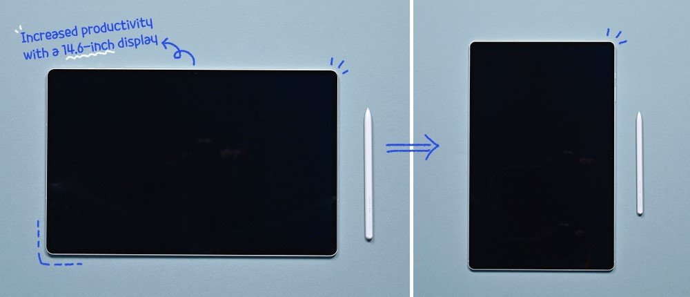 2 Measured diagonally, the Galaxy Tab S9 Ultra has a 14.6-inch full-size display and a 14.5-inch display when accounting for the rounded corners. The actual viewable area is less due to the rounded corners and camera hole.