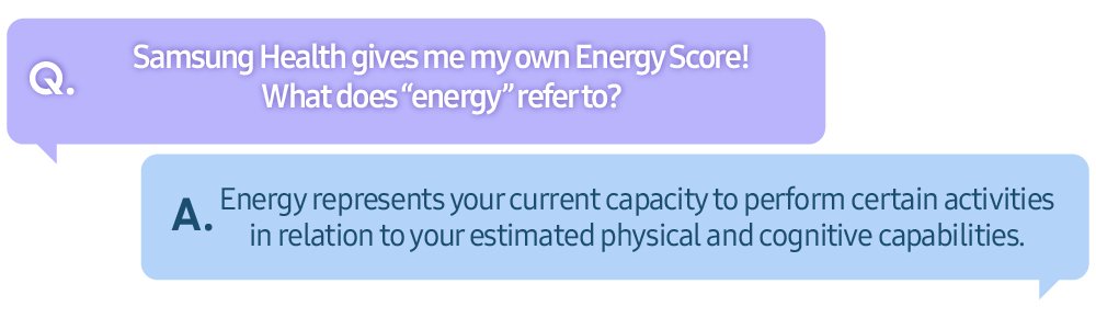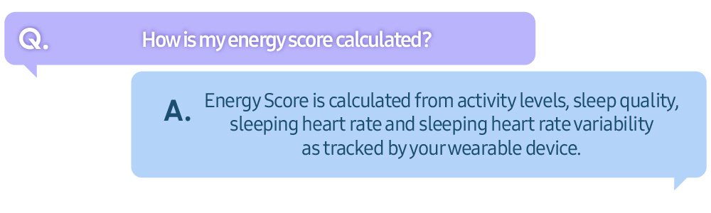 Energy Score is calculated based on physical activity levels, sleep quality, heart rate during sleep and heart rate variability during sleep as measured by wearable devices. Samsung Research developed the Energy Score feature based on scientific studies and clinical research that studied the correlation between these indicators and cognitive, self-reported and physical markers of energy.