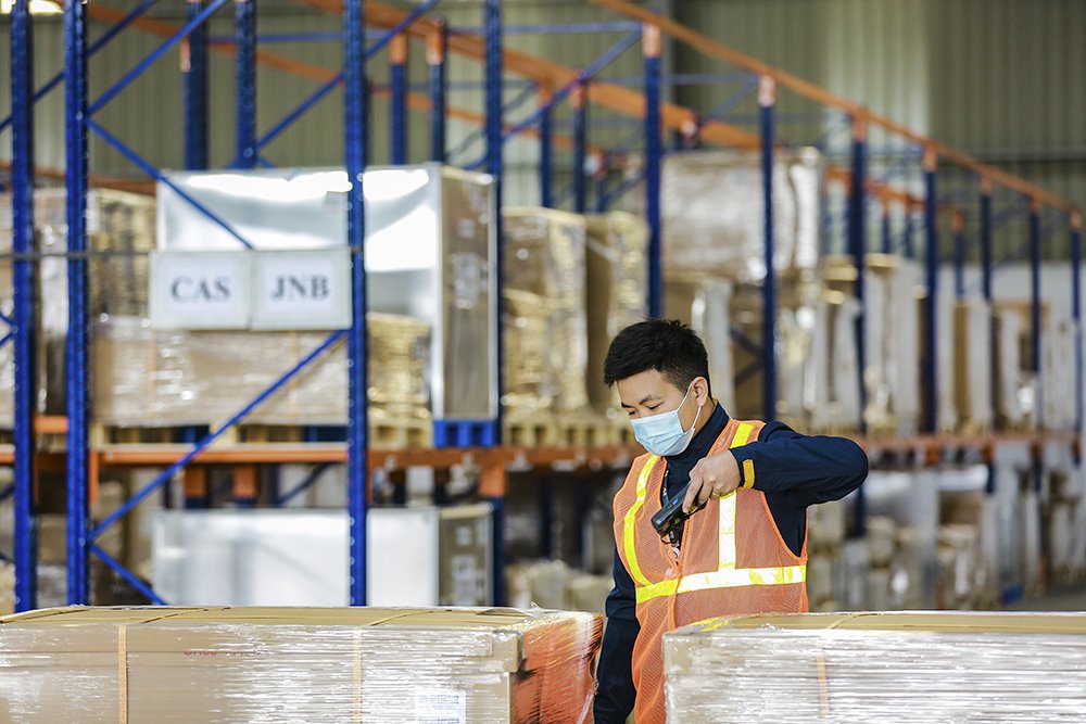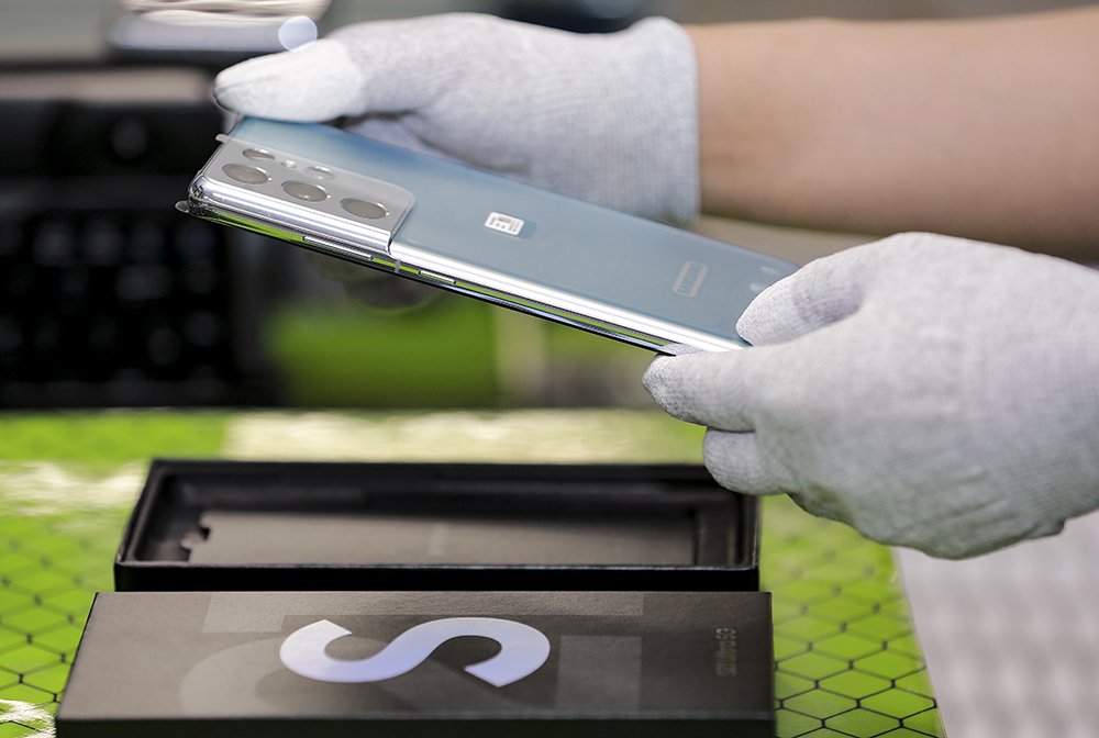 Team members at Samsung’s distribution center prepare the Galaxy S21 series for shipment to stores and customers across the globe.
