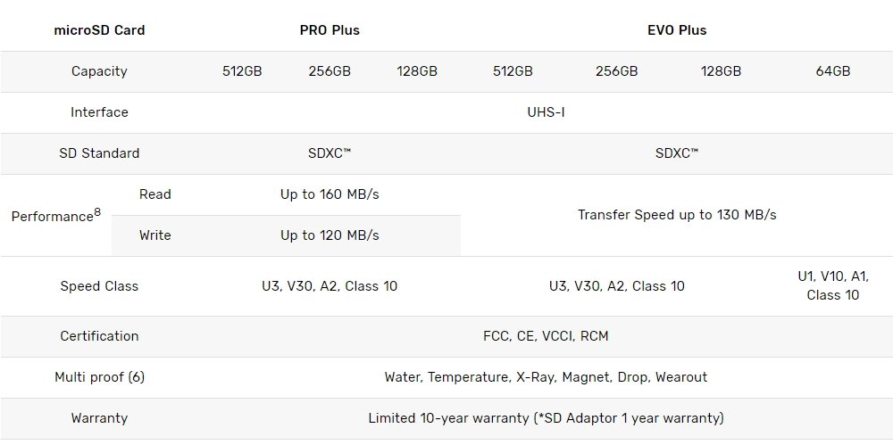 The EVO Plus microSD is designed to give casual users peace of mind by providing high reliability and stable performance during day-to-day use. It offers transfer speeds of up to 130MB/s,7 providing up to 1.3x faster sequential read speed when compared to the previous version. EVO Plus microSD card will be available in 64GB, 128GB, 256GB and 512GB capacity.