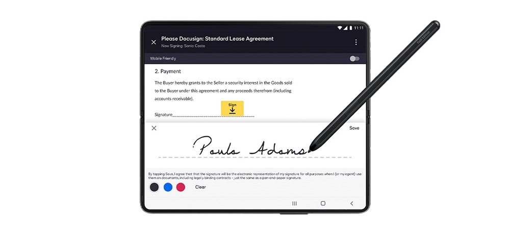 DocuSign,7 which offers the world’s leading e-signature solution and is used by 24 of the top 25 Fortune 500 Financial companies8 has also been optimized for Android 12L. The Galaxy Z Fold4’s takes the hassle out of signing agreements on large screens. Users can now quickly drag and drop email attachments in multi-view mode directly into DocuSign eSignature, seal deals quickly on the go with Samsung’s S Pen9 and the dedicated Flex Mode signature.