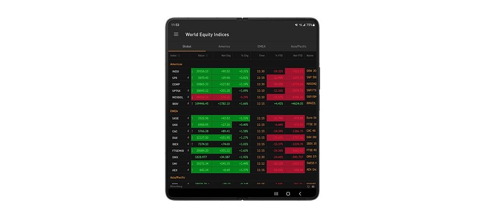 According to a recent survey, the Bloomberg Professional app5 is the most used financial services app by investment professionals, such as traders, analysts and portfolio managers.6 It takes advantage of the Galaxy Z Fold’s unique form factor to enable financial professionals to access Bloomberg’s market data, analytics, news and communications on the go in a more intuitive and immersive way, while preserving the user experience and functionality with which they are familiar. On Samsung Galaxy Z Fold4, the Bloomberg Professional app’s adaptive layout provides for easy continuity and multitasking on the go. Users can effortlessly switch from the cover screen, ideal for quick Instant Bloomberg (IB) conversations, to the large screen that makes it easier to read news stories, monitoring real-time market data, browse portfolios or perform chart analysis. This allows financial professionals to do familiar work in an enhanced way on their foldable device.