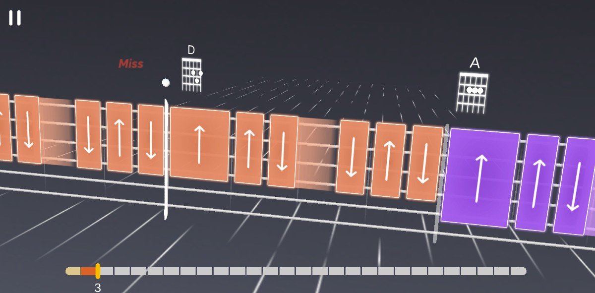 As previously mentioned, there’s the ability to access a song library which plays like a game of Guitar Hero. The app teaches you the chords, then dives you into a song with the goal being to learn a bunch of different popular songs as quickly as possible. While sometimes a bit buggy in terms of sound recognition (I’m testing a beta version of the app), it’s actually a good bit of fun. There’s a countdown and then you’re shown the chords and a strum pattern (up and down arrows) that plays along with a backing track of whichever song you’re learning.
