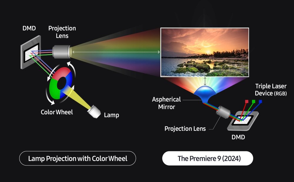 Aspherical Mirror: Allows for ultra-short throw projection. Following numerous simulations, Samsung engineers came up with the optimal curvature and applied it to the new The Premiere projector.