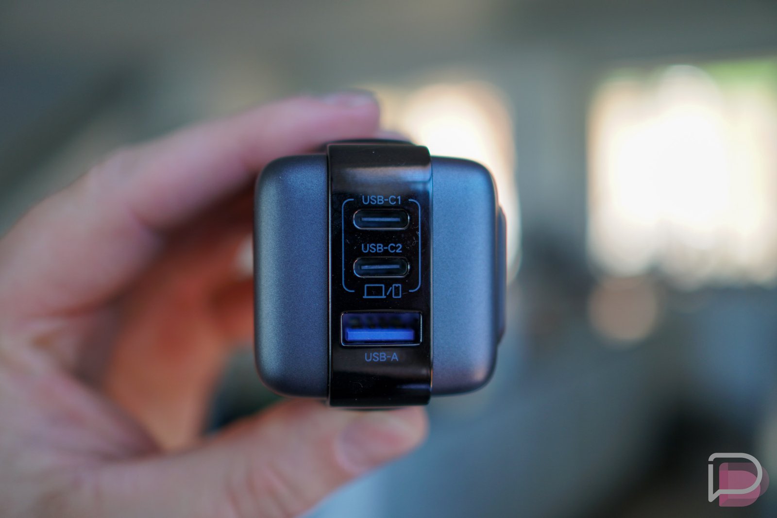The 65W model features three ports: 1 USB A port, plus 2 USB C ports. The top USB C port supports 65W charging, the bottom supports 30W, and the USB A port is listed at a max of 22.5W. When using the ports simultaneously, those numbers differ.