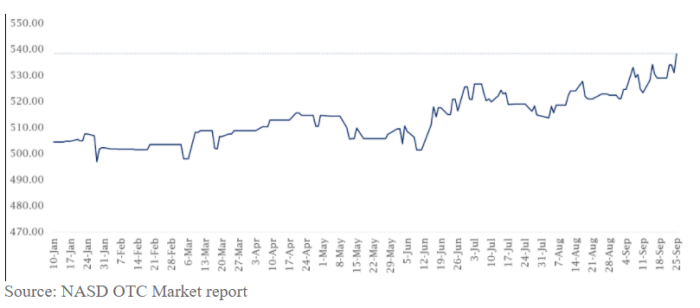 The market capitalization of NASD OTC Securities Exchange Market, gained about N9.22 billion in value, from N528.90 billion recorded in the previous week to N538.12 billion at the close of trading session, Friday September 25, 2020.