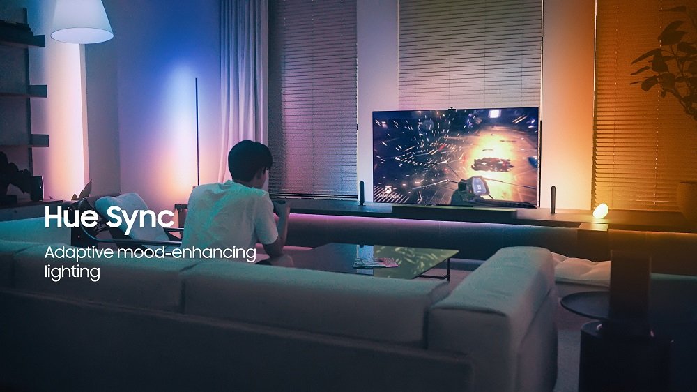 ※ Compatible lighting must be purchased separately; paid subscription of the Hue Sync app is required through Samsung TV app.