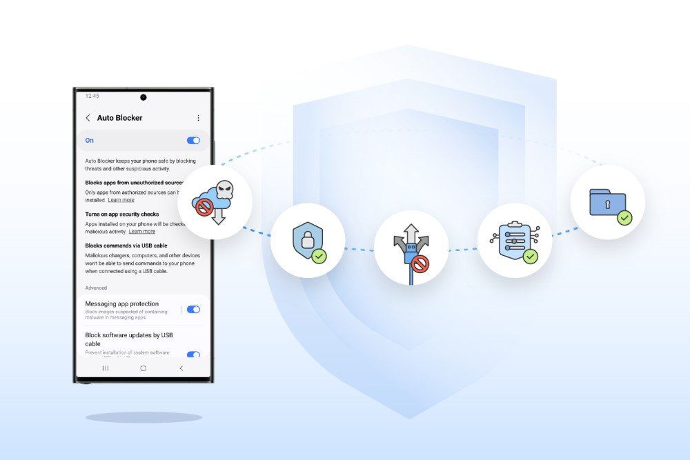 Auto Blocker is a package of additional security measures and the latest to join Galaxy’s stable of security and privacy innovations. Just as there is not one single type of cyber threat, there should never be just one approach to security. That’s why Auto Blocker’s safeguards are wide-ranging; it gives users more ways to stay safe, on their terms and with minimal effort.