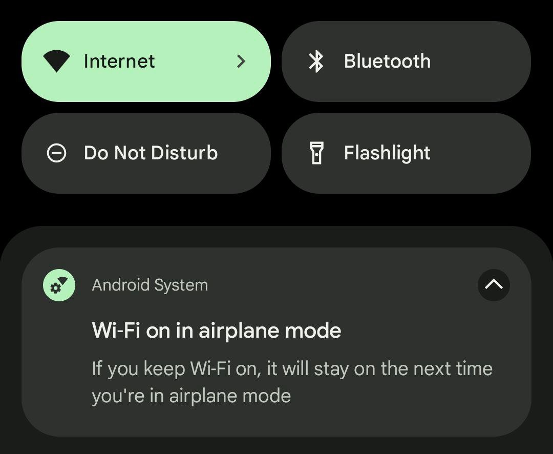 This is just like Android 11’s change for Bluetooth. Before Android 11, Airplane mode would disable everything, but now, it too can be toggled on and kept on following a switch into Airplane mode.
