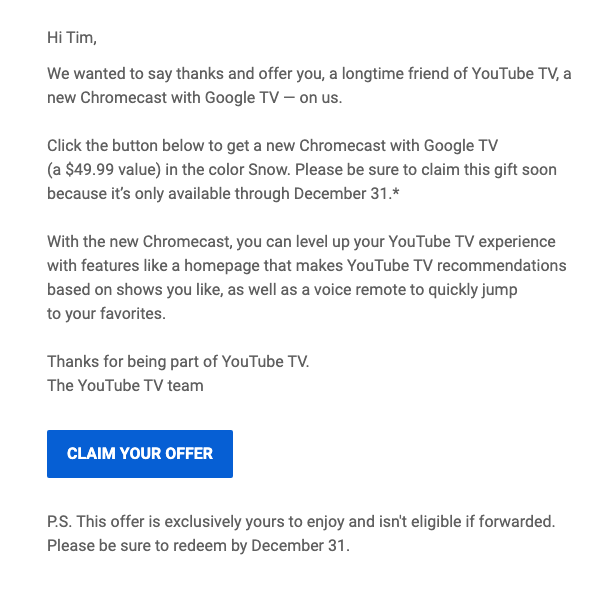 Subscribe to YouTube TV? You may want to check your email! Google is sending out emails entitling subscribers of YouTube TV to a free Chromecast With Google TV. That’s a $50 value and a solid holiday gift.